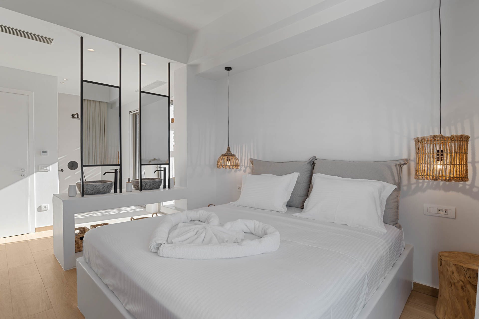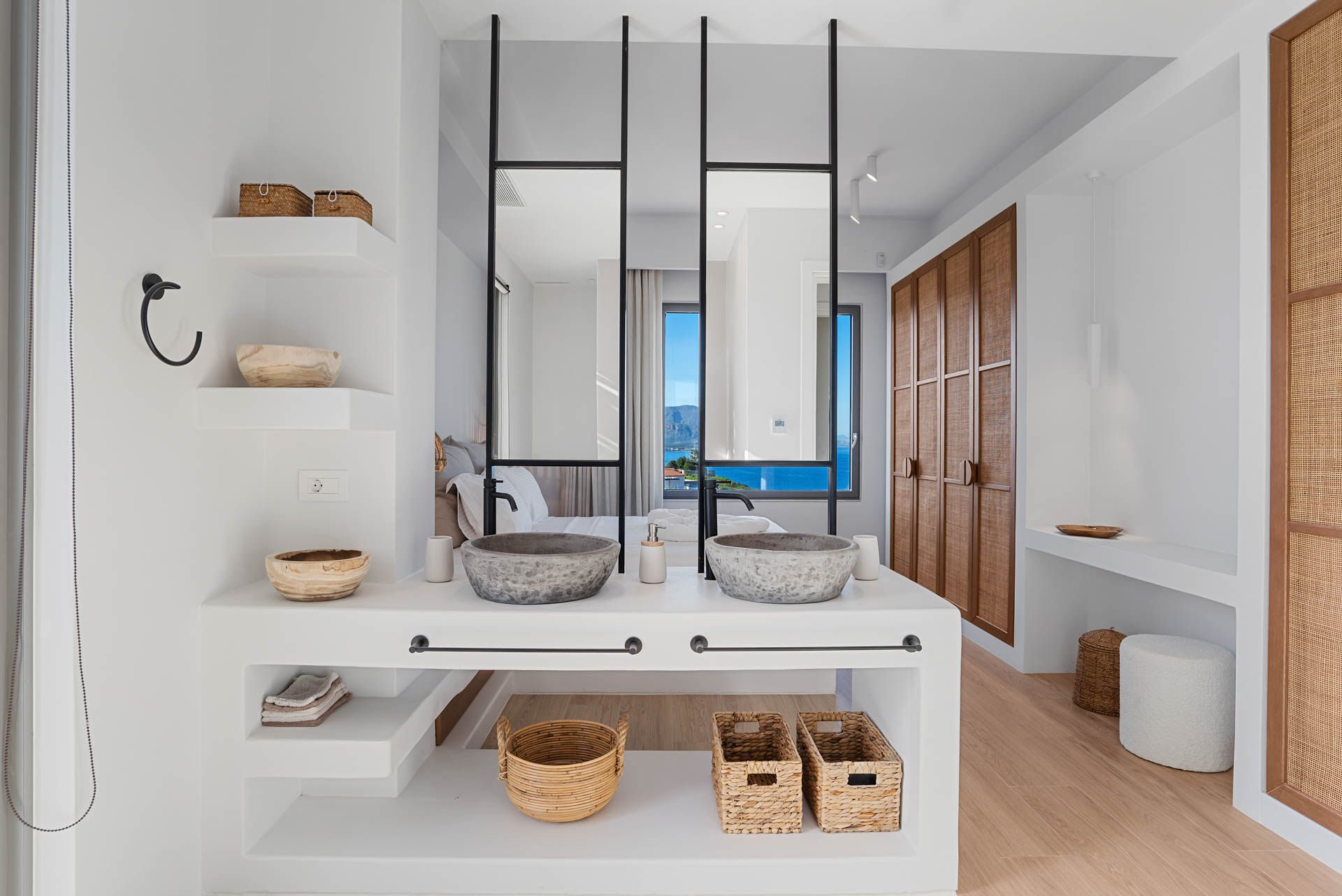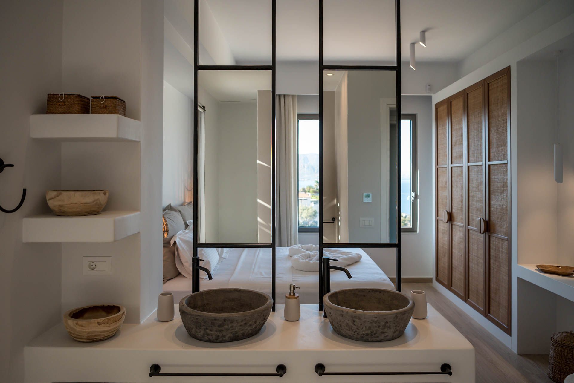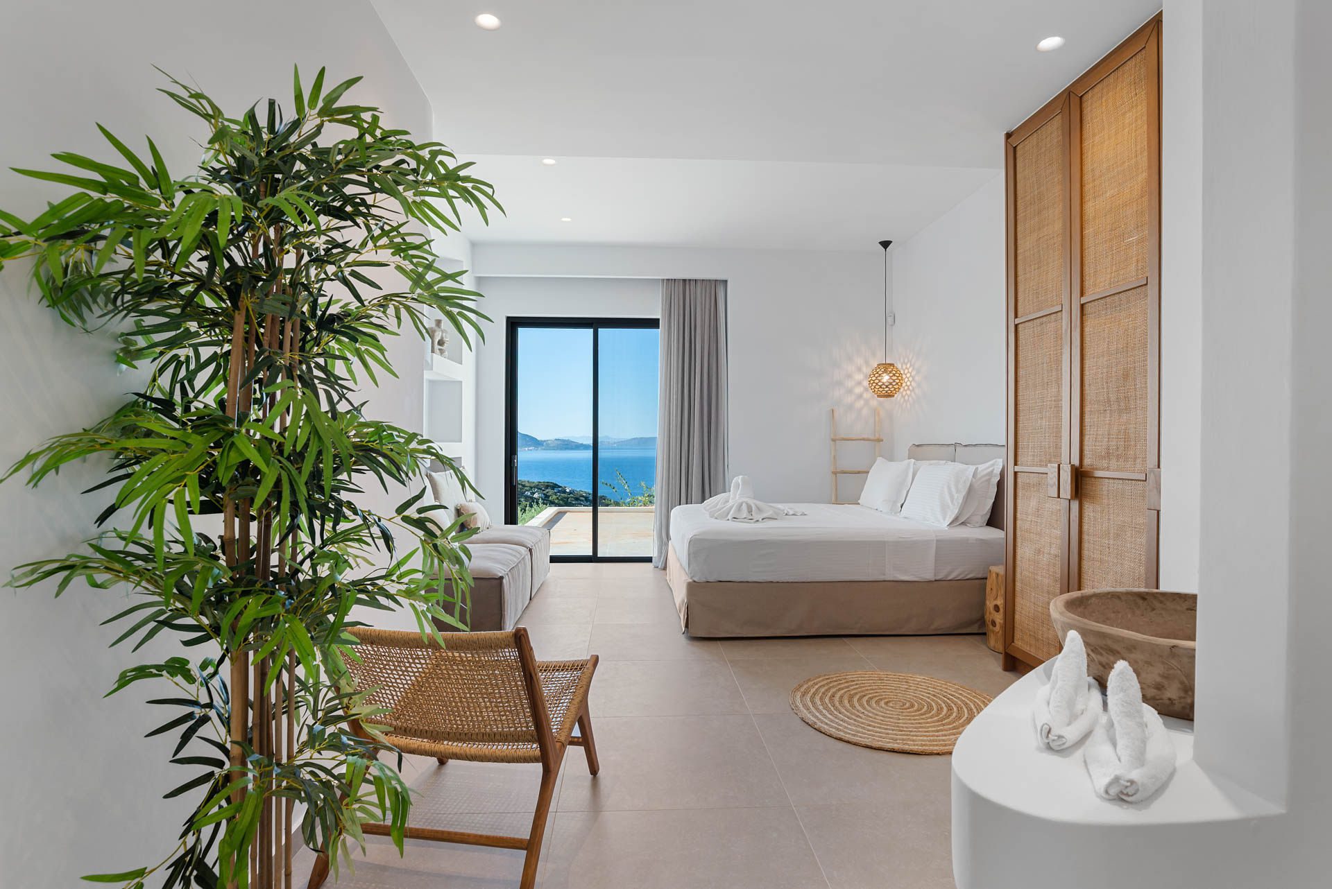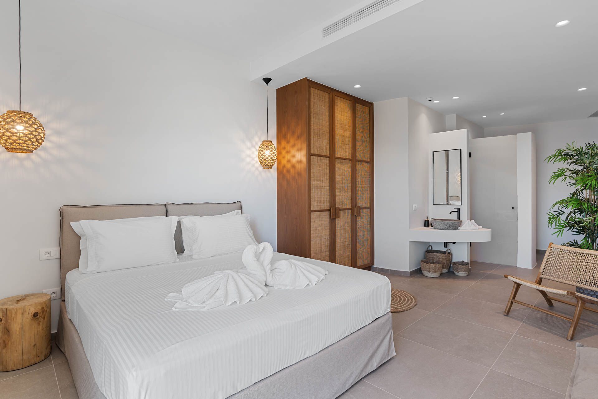 Villa Eureka boasts four spacious and stylish en-suite bedrooms: The main one on the upper level, featuring a serene outdoor bathtub for ultimate relaxation.